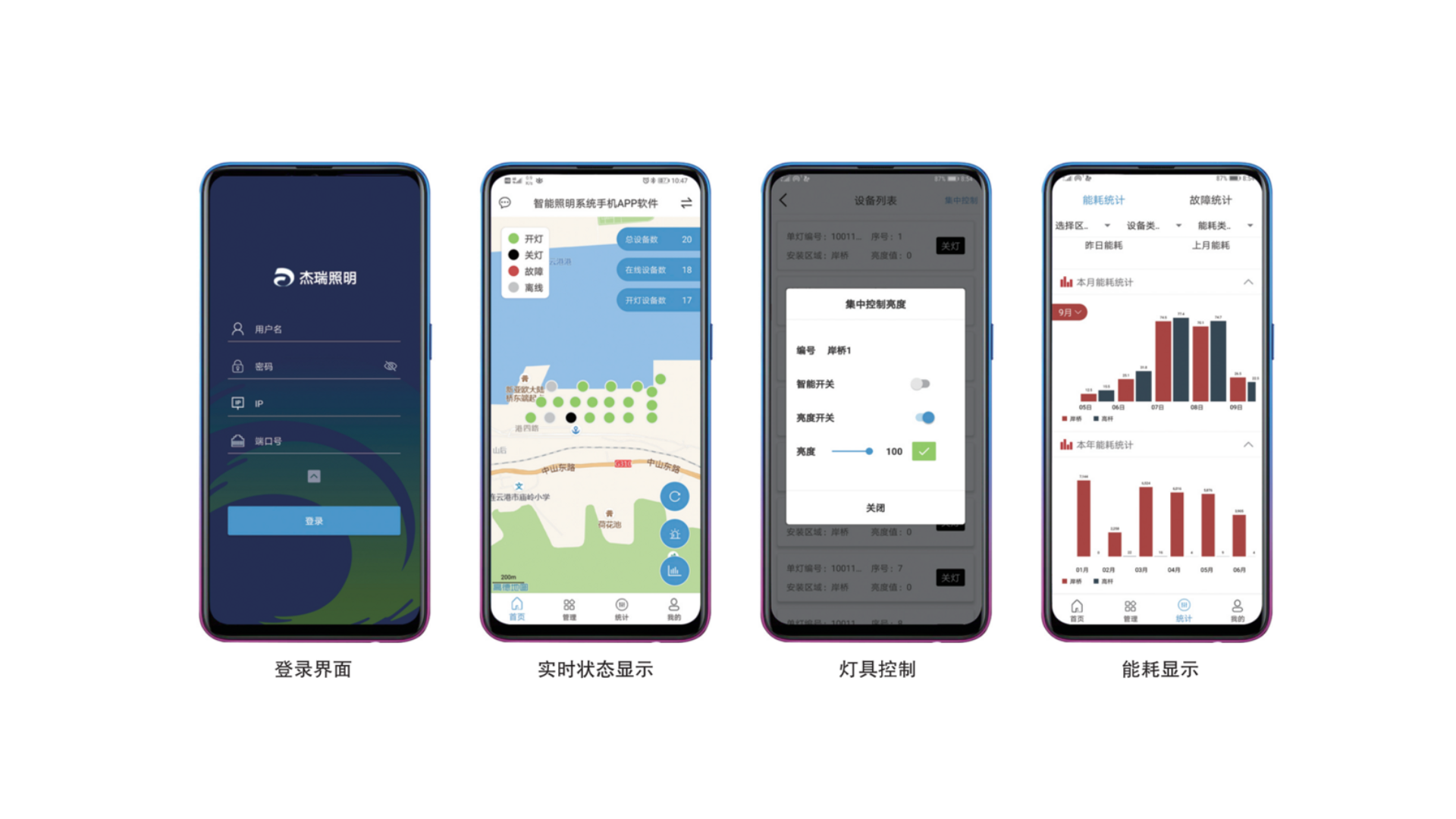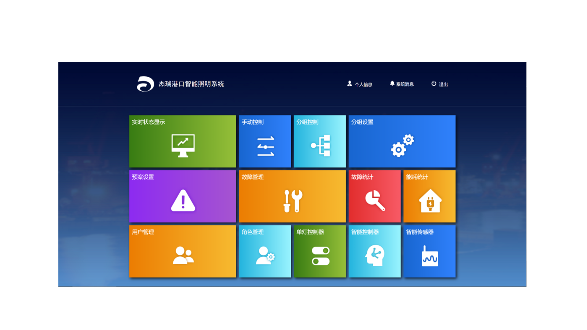 杰瑞智慧照明系统JR-LCS-Smart2000是杰瑞针对港口岸桥和堆场、厂房等作业区域的照明特点,利用云计算、大数据、人工智能、视频检测、嵌入式与物联网等技术设计开发的全新一代自适应智慧照明系统。系统具备智能控制和高效节能两大特点,实时感知作业区域内的人、车、环境,支持与华亿网页版_华亿网页版生产调度系统对接,实现作业区域内的自适应照明,达到高效节能目的。系统兼具灯具状态实时显示、灯具故障实时推送、能耗大数据实时统计、控灯预案自主可调等多种功能,满足华亿网页版_华亿网页版对照明系统的精细化管理。系统包含:智能照明管理平台、智能灯具控制器、高稳定性LED灯具(内含单灯控制器)、高精度传感器等一整套软硬件设备,同时拥有桌面Web端和手机端两种管理方式。