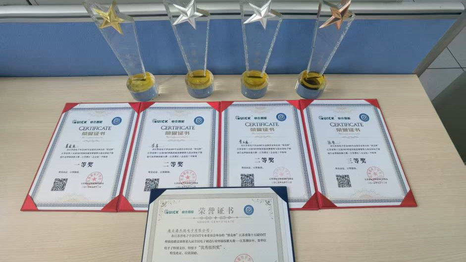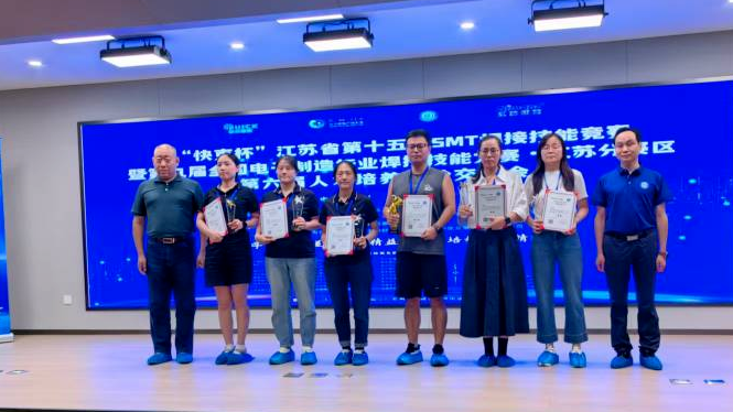 近日,由江苏省电子学会SMT专业委员会主办的“快克杯”江苏省第十五届SMT焊接技能竞赛暨第九届全国焊接能手选拔赛顺利落幕,中国船舶集团旗下华亿网页版_华亿网页版(下称“杰瑞电子”)选派4人参赛并全部获奖。其中,葛露露荣获一等奖,李萍、曾庆露荣获二等奖,徐梦荣获三等奖,杰瑞电子喜获“优秀组织奖”。